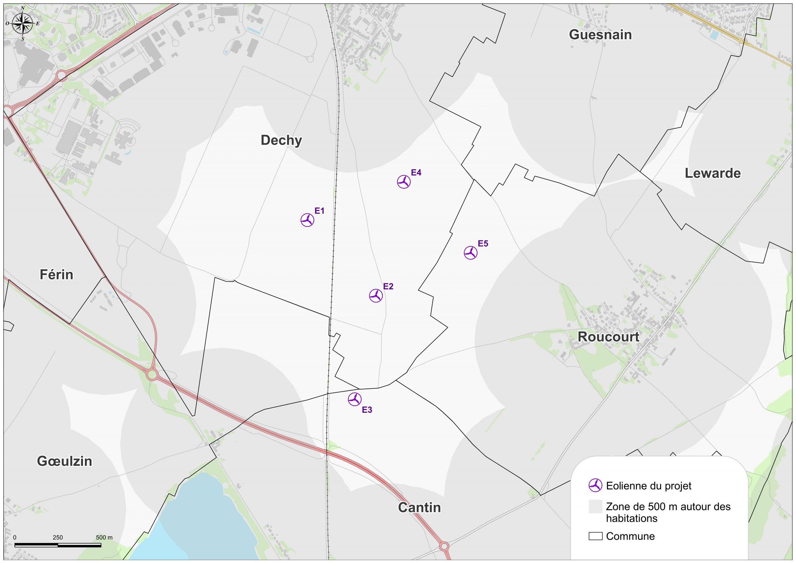 D’autres contraintes techniques sont à prendre en compte : éloignement suffisant de la voie ferrée, des routes départementales, du centre radioélectriques de l’hôpital de Dechy, etc. L’ensemble de ces données ont permis la délimitation de la zone d’implantation potentielle.
